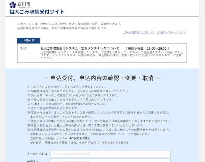 | 発語や耳が不自由な方 | インターネット以外にも、ごみ対策課宛てにファクス(042-531-5800)も可能。ファクスの際は住所と氏名、ファクスの番号、出される粗大ゴミの品目、大きさと数量を紙に記載して送る |