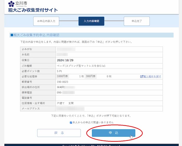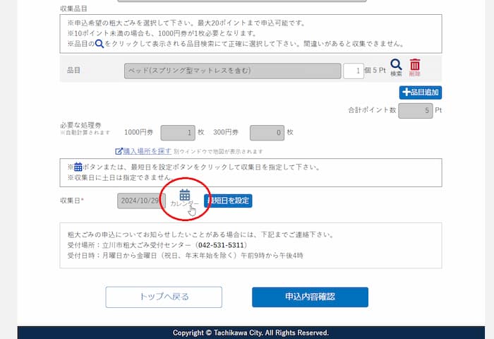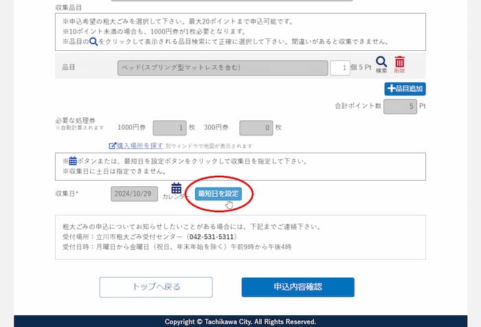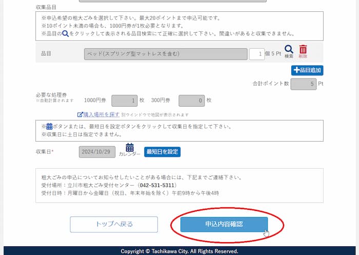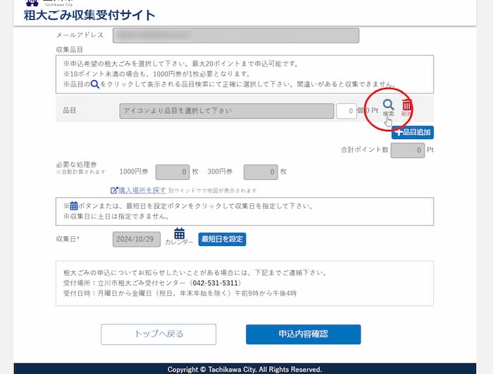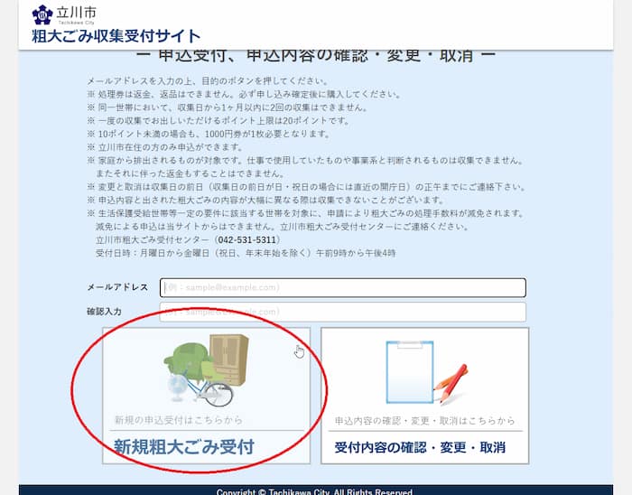 | 粗大ゴミ処理券の注意点 | 必ず申し込み後に購入する。余ったポイントの払い戻しや、間違って購入した粗大ごみ処理券の払い戻しは不可 |